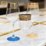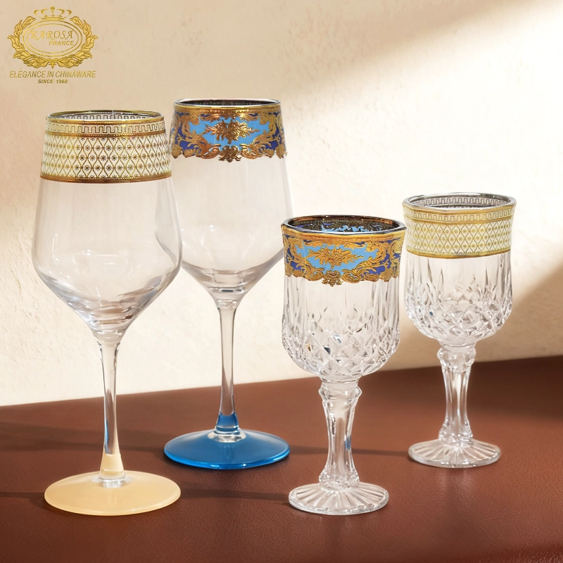This KAROSA glass wine & champagne flute set centers on luxurious gold pattern design, made of high borosilicate crystal glass—highly transparent and durable, paired with hand-gilded + colored glaze pattern technique, the blue-gold/lattice decorations are exquisite and elegant, showing light luxury texture.