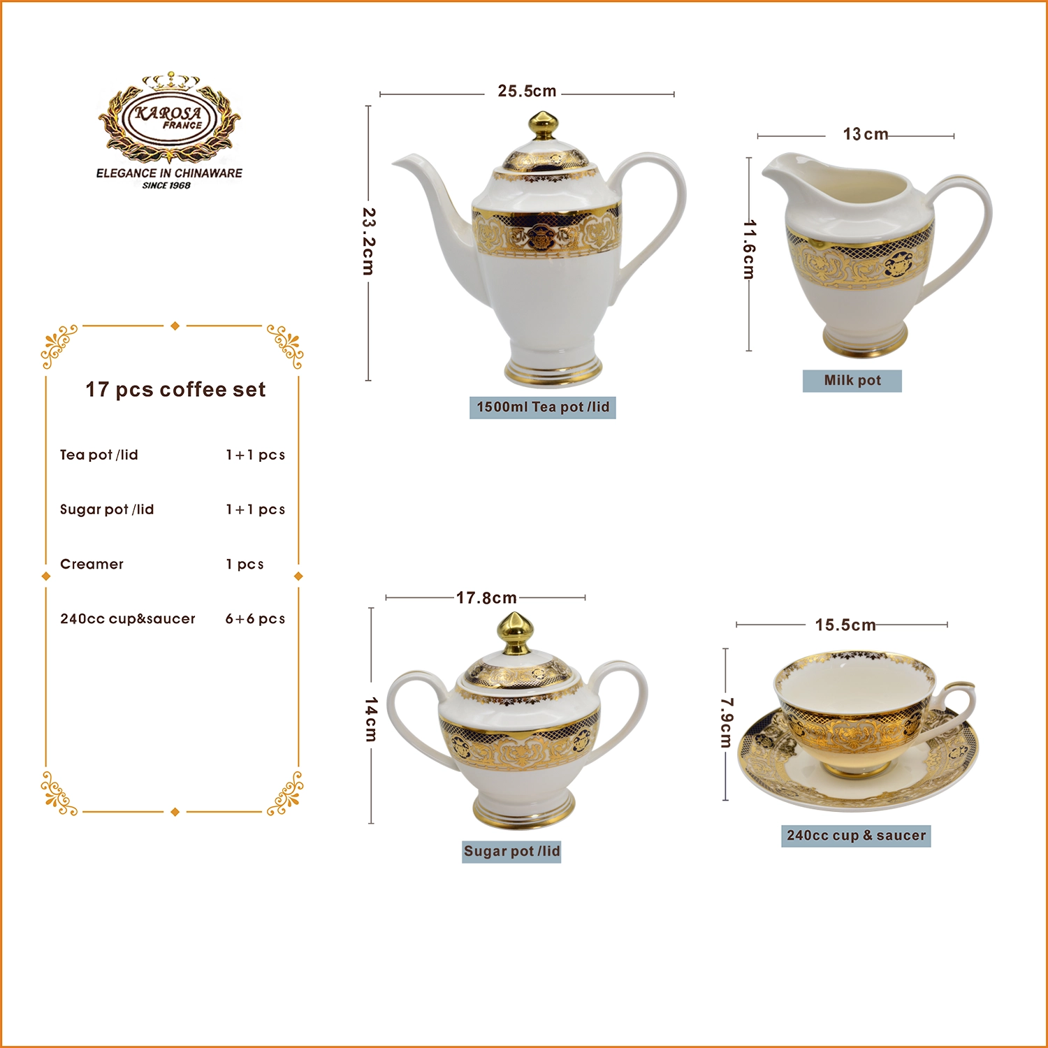 This KAROSA bone china tea set is based on the retro palace style design, made of high-bone-content bone china fired at 1300℃—the porcelain body is smooth and delicate, paired with hand-carved gold rim technique, and the exquisite and gorgeous patterns show classic luxurious elegance.