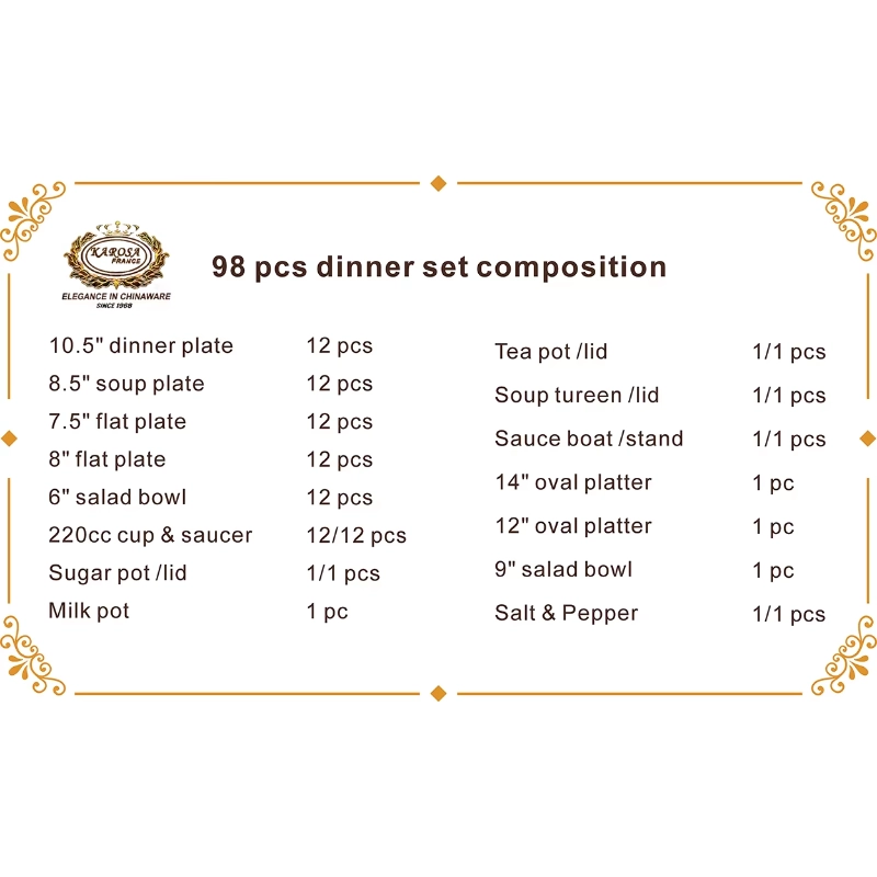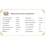 The 98pcs dinner set includes dinner plates, soup tureens, cups & saucers, etc., suitable for 12-person dining scenarios—during family gatherings, it is the focus of the table; in hotel banquets or wedding receptions, this tableware set quickly elevates the style.