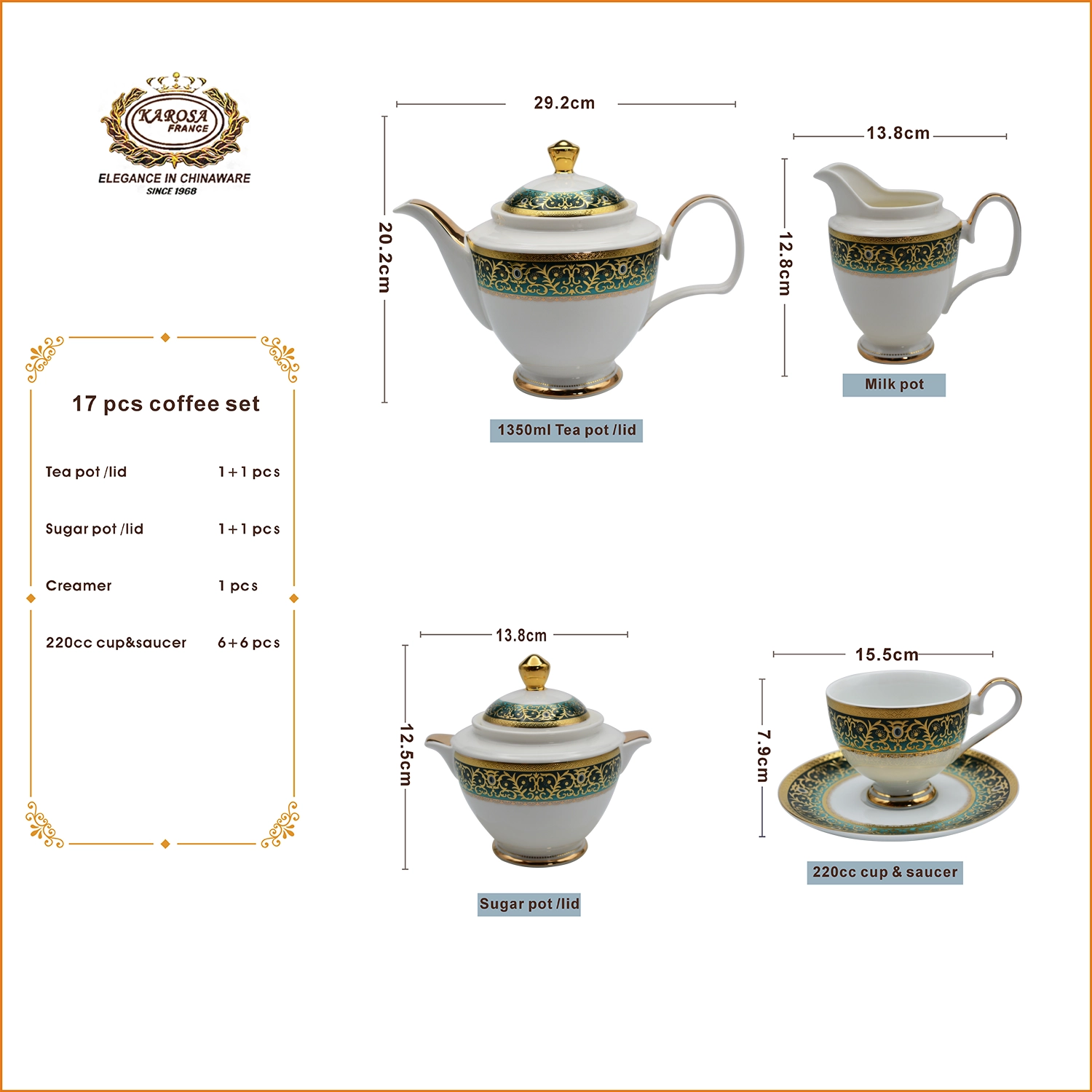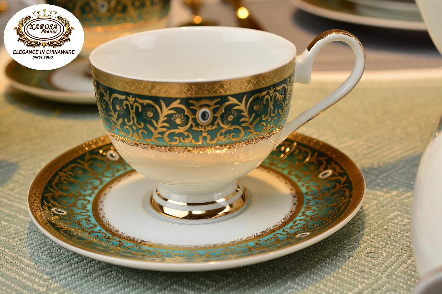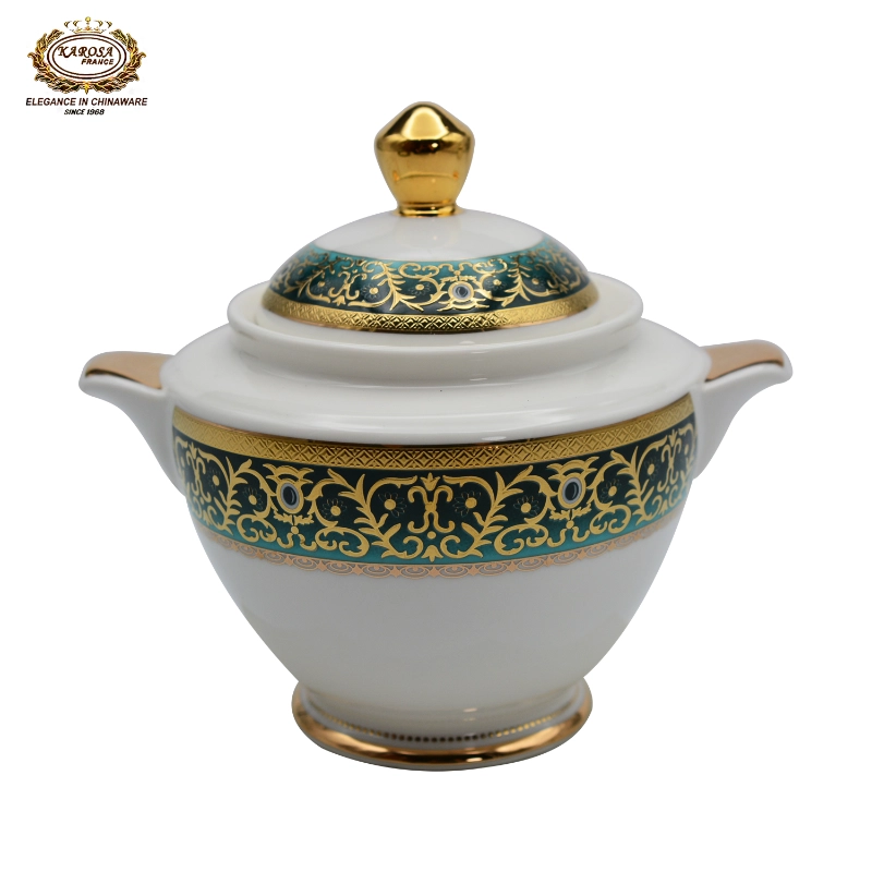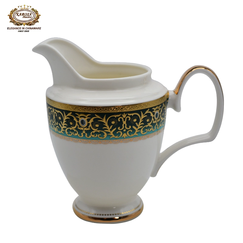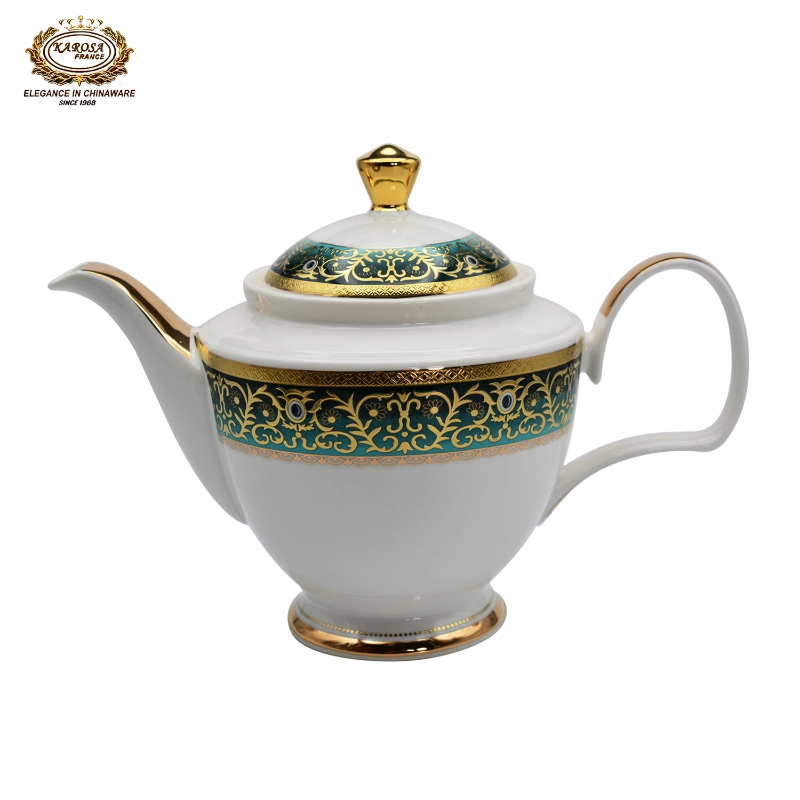 This KAROSA bone china tea set features turquoise-gold color contrast as its design highlight, made of high-bone-content bone china fired at 1300℃—the porcelain body is smooth and translucent, paired with hand-carved turquoise-gold pattern technique, and the intricate patterns show light luxury palace texture.