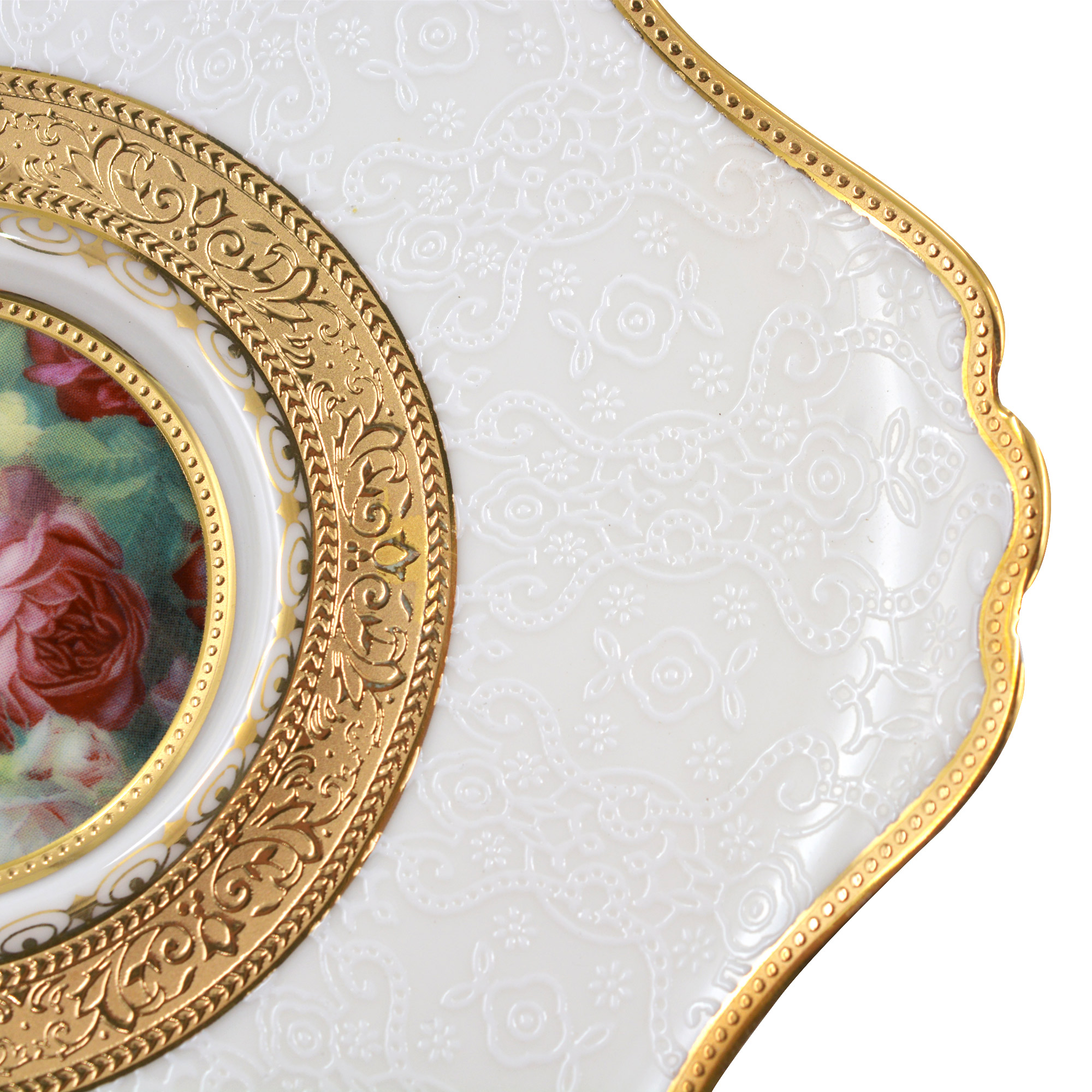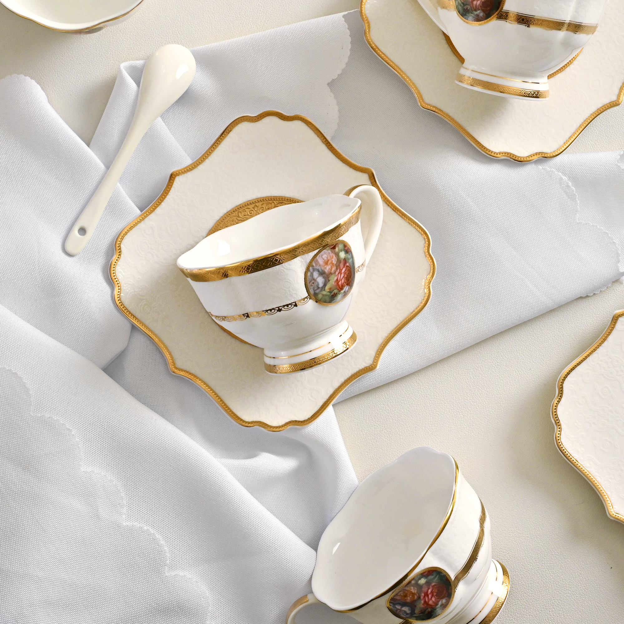 Luxury 24K gold-plated floral bone china tea set, elegant vintage design, ideal for afternoon tea and premium gifting.