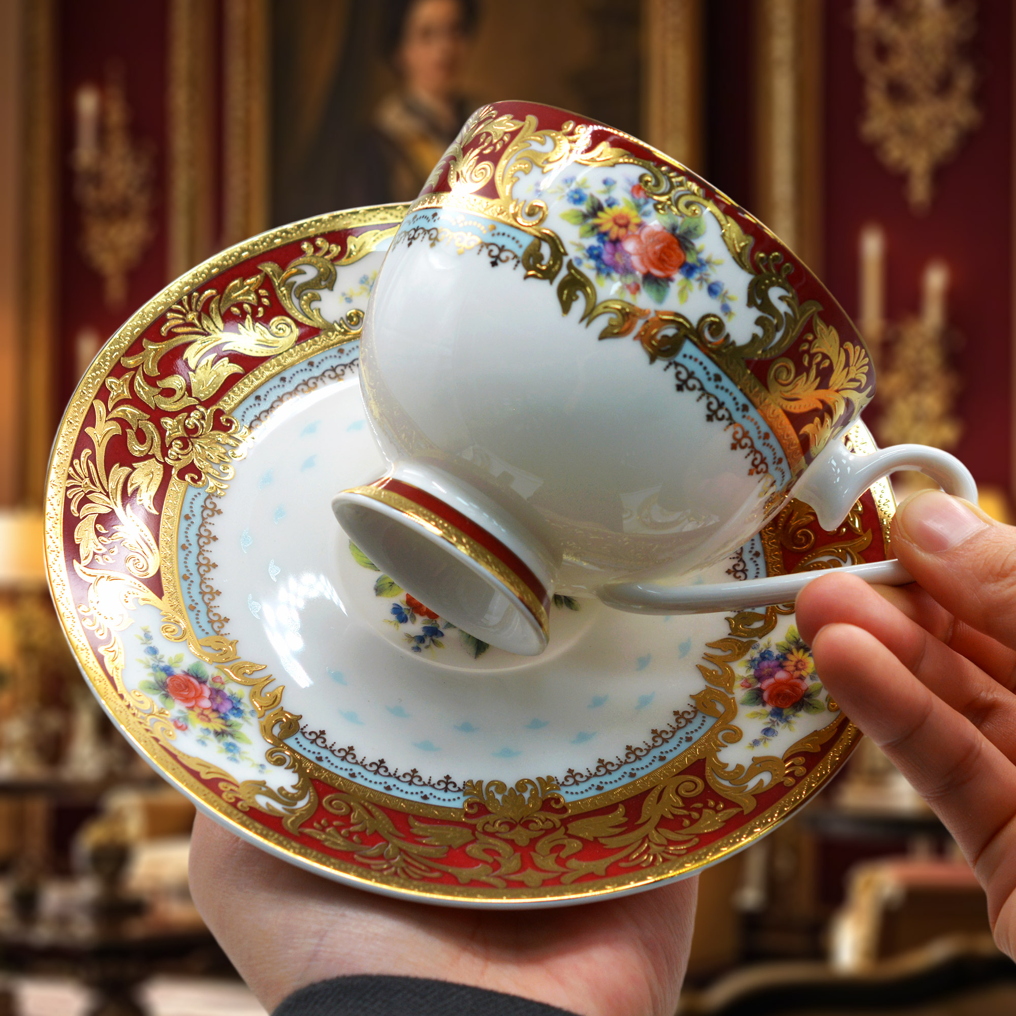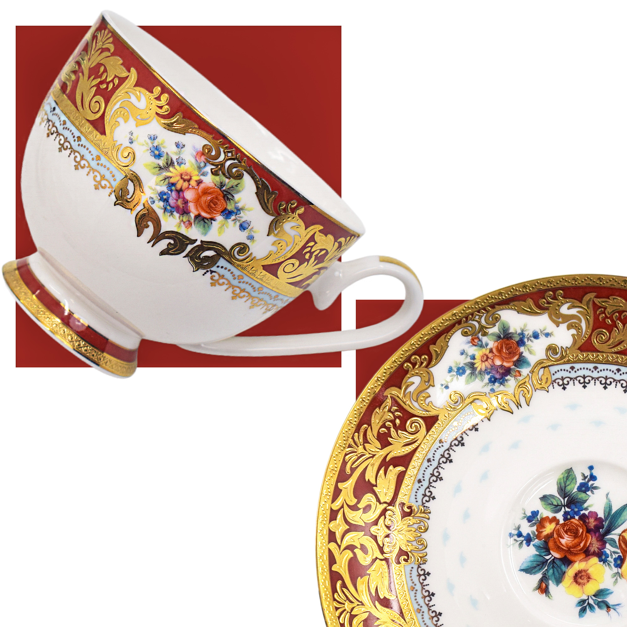 Royal red & gold floral bone china tea set, ornate European scrollwork, complete 15-piece service for formal dining and weddings.